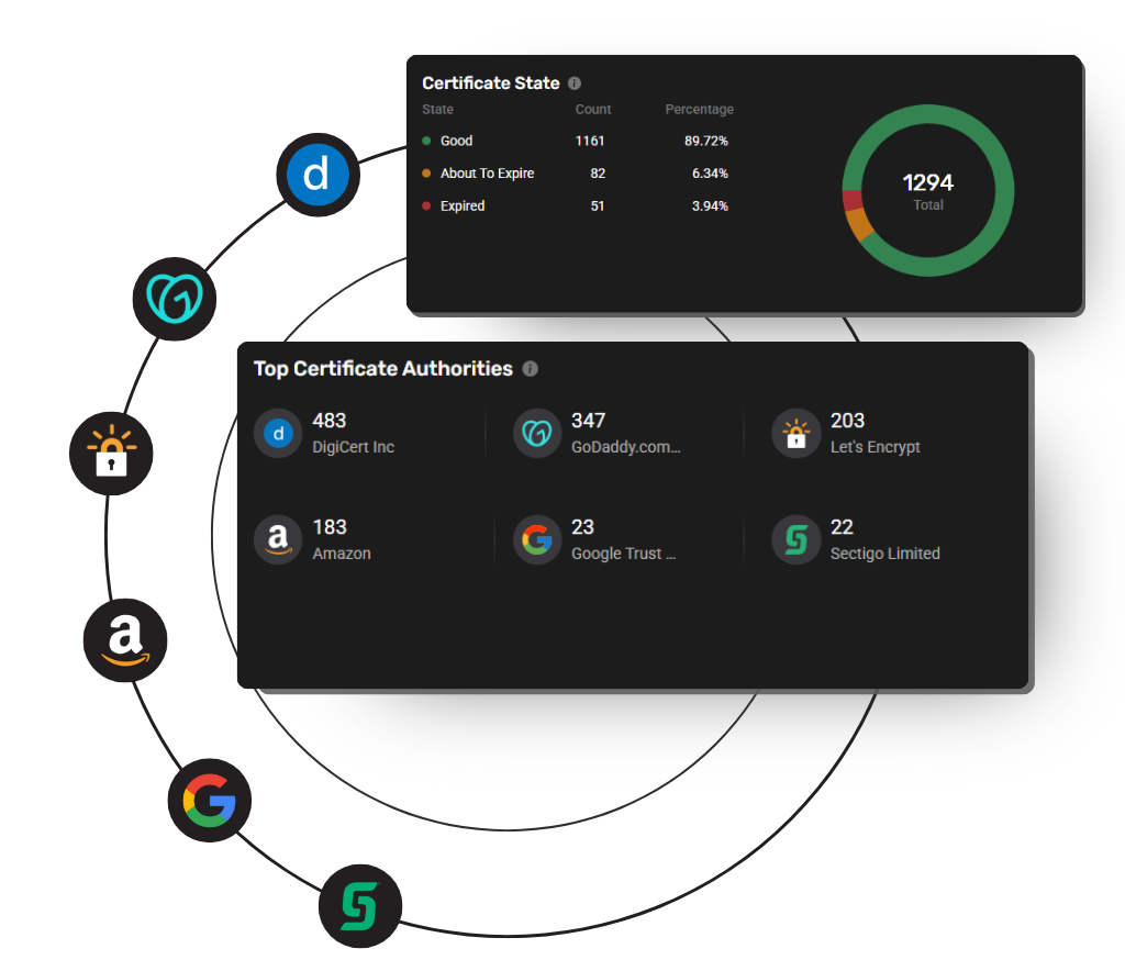 - Proactive Prevention of Outages and Weak Crypto: Detect expiring, misconfigured, weak, or unauthorized certificates early to prevent disruptions and maintain trust.